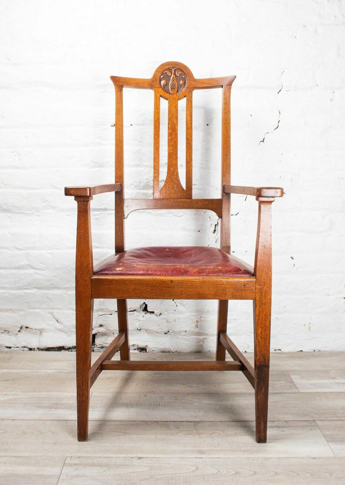 A Large Antique Arts Crafts Oak Framed Carver Arm Hall Chair Vinterior